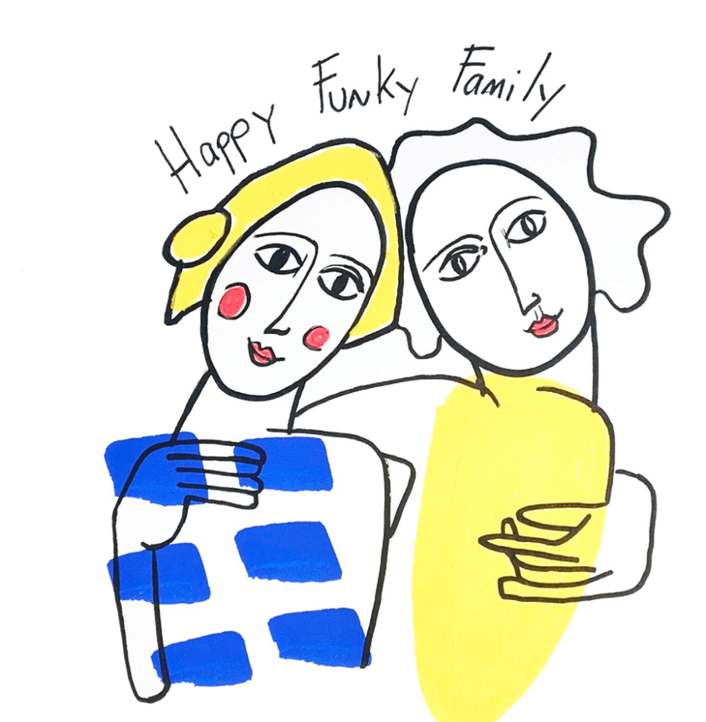 « Il existe bien évidemment des œuvres d’art sublimes pour tous les goûts, tous les styles et tous les budgets. Cependant rien ne peut égaler la joie et le bonheur que procure une œuvre à la commande. Nos clients se plongent dans leur histoire de famille pour nous décrire les personnages qui vont constituer une œuvre d’art. Cette première introspection est déjà source de bonheur » Nathalie et Caroline, fondatrices de Happy Funky Family