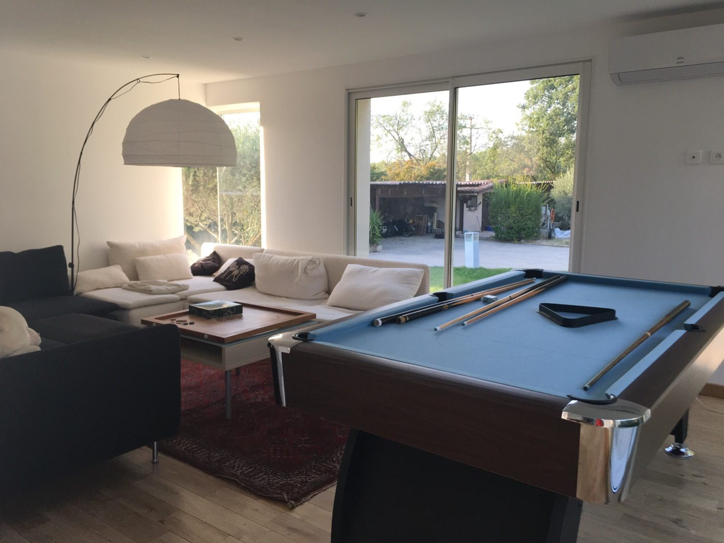 Certains la surnomme la maison « décathlon » (rires). La maison est de plain-pied. Il y a une grande salle à manger-cuisine (40m2) donnant sur une véranda, qui est un jardin d’hiver avec jacuzzi intégré. De l’autre côté, un grand coin repas extérieur qui longe une vigne, avec un salon musique-lecture avec un piano, puis la salle de sport avec un sauna, hammam et du matériel de fitness professionnel. Pour finir, salle de billard et babyfoot avec un espace pour les enfants tout petits.