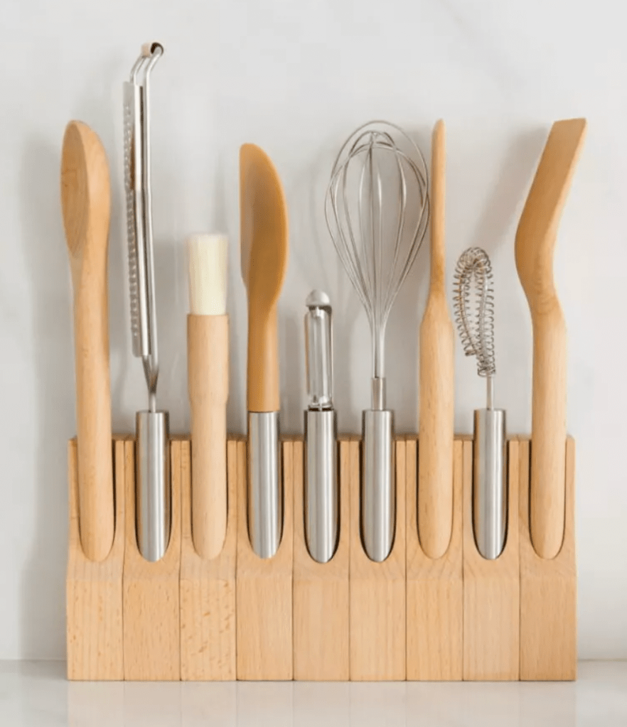 Ils sont non seulement hyper pratiques, mais aussi super beau et le système de rangement est GENIAL ! Ce pack contient : la râpe, le fouet, l’éplucheur, le mini-fouet, la maryse, le pinceau, la cuillère, la palette, la palette coudée & les 9 socles aimantés.
